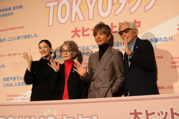 山田洋次監督の最新作『TOKYOタクシー』の大ヒット御礼舞台挨拶が12月3日に東京・新宿ピカデリーで行われた。壇上には出演の倍賞千恵子、木村拓哉、蒼井優、山田監督が登場した。